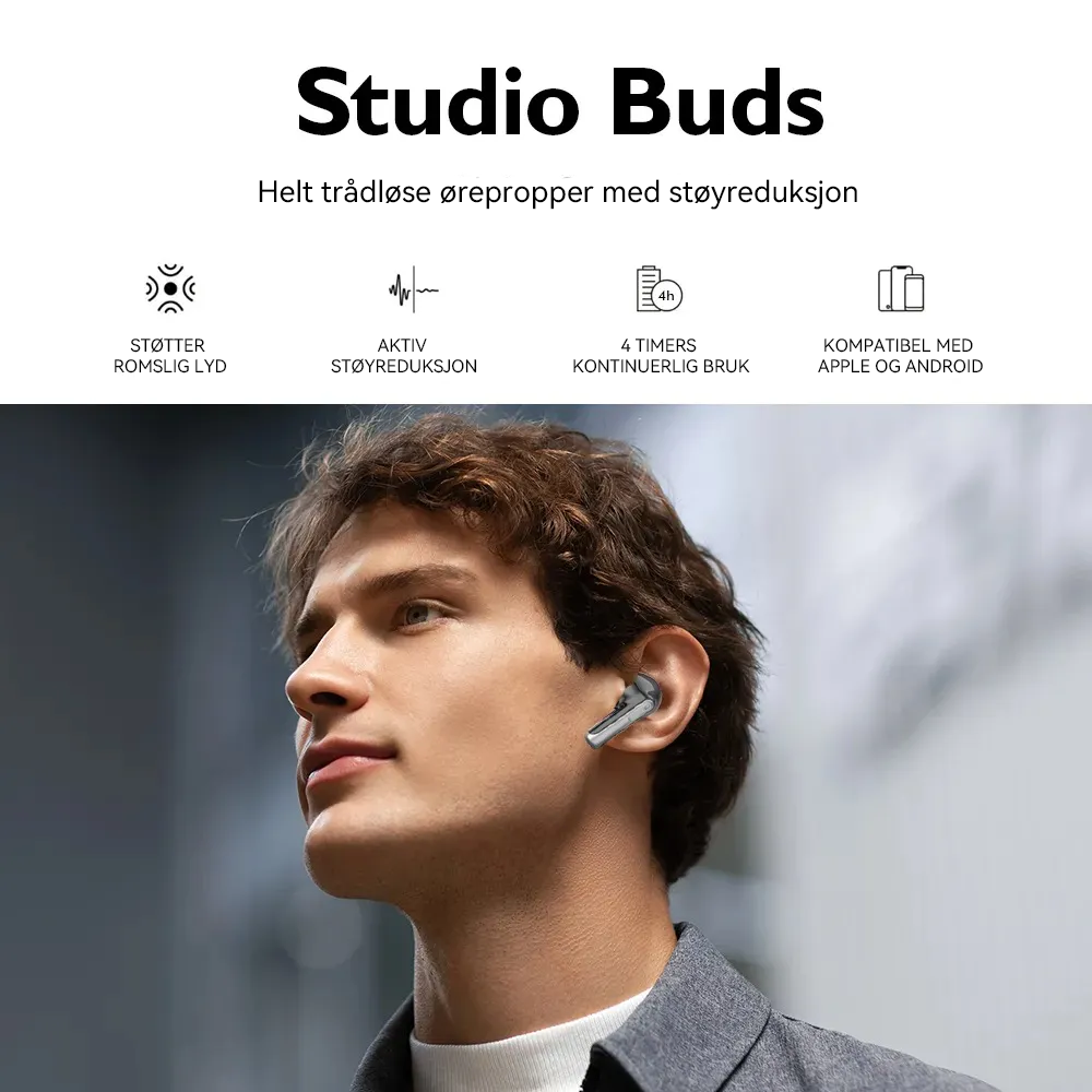 - Kontroller lyden din med to forskjellige lyttemoduser: Aktiv Støyreduksjon (ANC) og Åpenhetsmodus (Transparency mode).